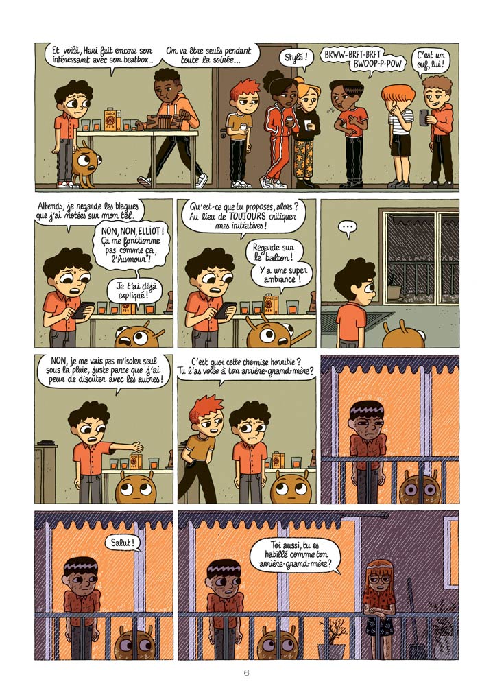 Le dessin est coloré, quoiqu’un peu pâle. Les personnages, aux traits caricaturaux propres au genre, s’animent et donnent un rythme soutenu à la lecture avec une chute à chaque fin de planche comme le rappelle l’auteur en introduction. Mais en même temps le choix est de prendre le temps de tisser une trame principale qui tourne autour du quotidien d’Elliot et de ses angoisses. Le bouquin prend aussi une dimension plus subtile et finalement assez inattendue quand l’attention se décentre de son héros pour élargir la problématique du mal-être sur son entourage. L’humour cède ainsi parfois sa place, d’une façon subtile, à un réalisme plus sombre autour de problématiques familiales dramatiques.