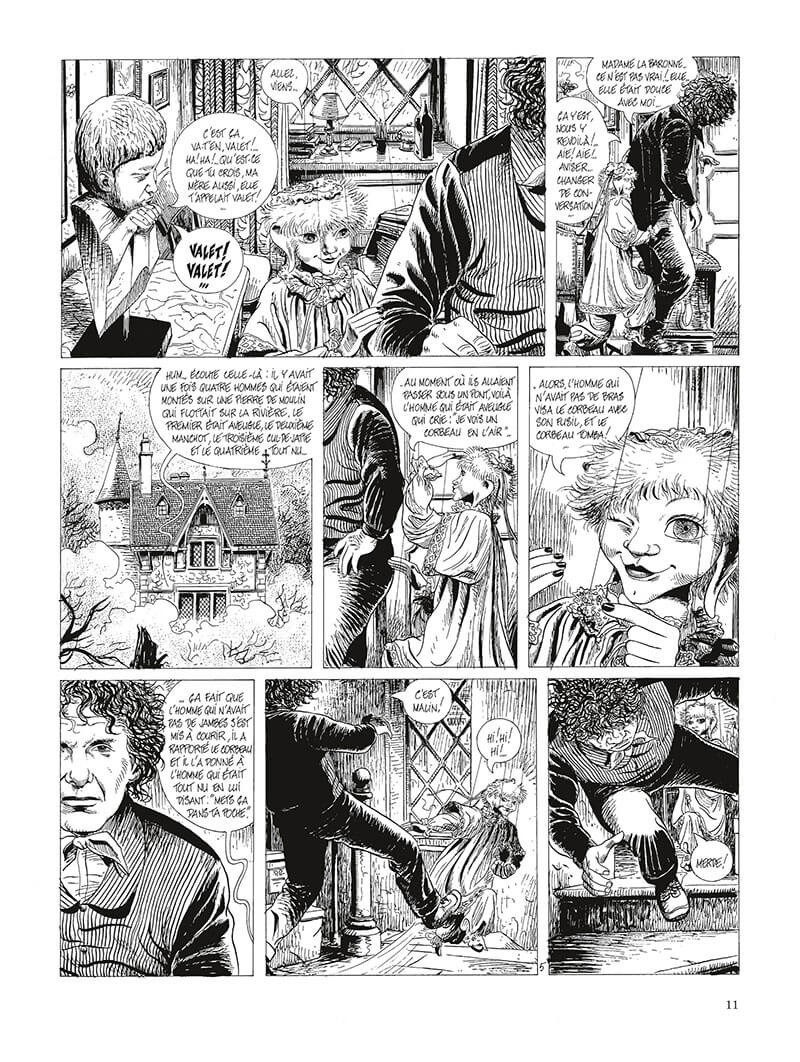 Une princesse-marionnette, un baronnet de bois, une « bébête » mystérieuse, une créature lunaire qui parle et un majordome tout ce qu’il y a de plus classique, auquel revient l’épineuse tâche de gérer tout ce petit monde surnaturel. Une ambiance étrange, sur laquelle flotte l’ombre de la baronne, propriétaire du domaine commun à tous.