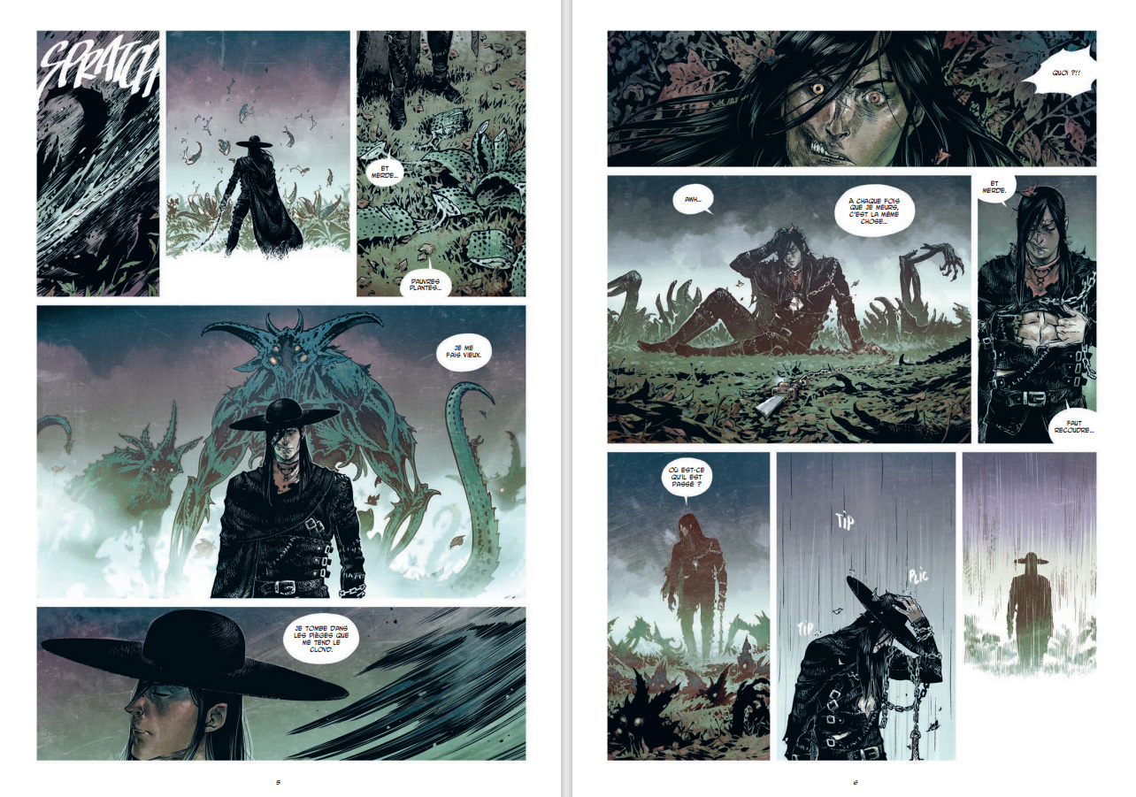 Passons au résumé maison, c’est tellement mieux (non). Après un bon petit reset apocalyptique, l’humanité revient plus ou moins au moyen âge comme nous l’indique le résumé éditeur. Mais un moyen âge à la Walking Dead. Je m’explique : c’est la merde, on en est revenu à mettre des coups de lance ou devoir retrouver des bouquins pour piger comment faire des trucs, mais bon il y a quand même des zozos qui se baladent avec des 4×4 voitures trafiquées, ce moyen âge là , vous voyez ? Dans ce moyen âge, figurez-vous qu’il y a également de la brume comme dans The Mist, où il vaut mieux éviter de mettre les pieds sous peine de gros bobos. Dans cette bonne ambiance nous retrouvons donc notre bon vieux Funérailles (bien longtemps après la série qui lui est dédiée). Il se balade tranquille peinard et là bim il tombe sur un duo improbable qui lui redonne un peu foi en l’humanité, du coup pourquoi ne pas faire un bout de voyage ensemble, histoire de voir ou cela le mène ?