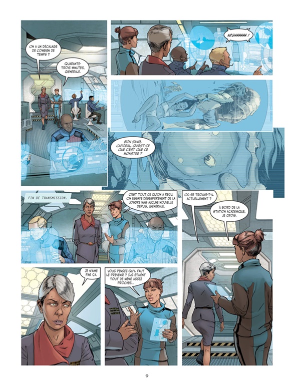 Mes dernières lectures ont été pour moi assez calamiteuses. Je me suis même demandé un moment si j’ aimais encore la BD. Rien que pour ça, je remercie ce titre Sol-13 pour me redonner un peu de plaisir pendant une lecture. Enfin une histoire linéaire, claire et avec une crédibilité qui tient la route. J’ ai aussi bien reconnu tous les personnages et trouvé les dialogues cohérents. Punaise que ça fait du bien. Certes le récit est assez basique mais le décorum est convaincant. Vous y trouverez certainement pas mal de similitudes avec des grands films de SF. Allez savoir qui s’est inspiré de qui ?