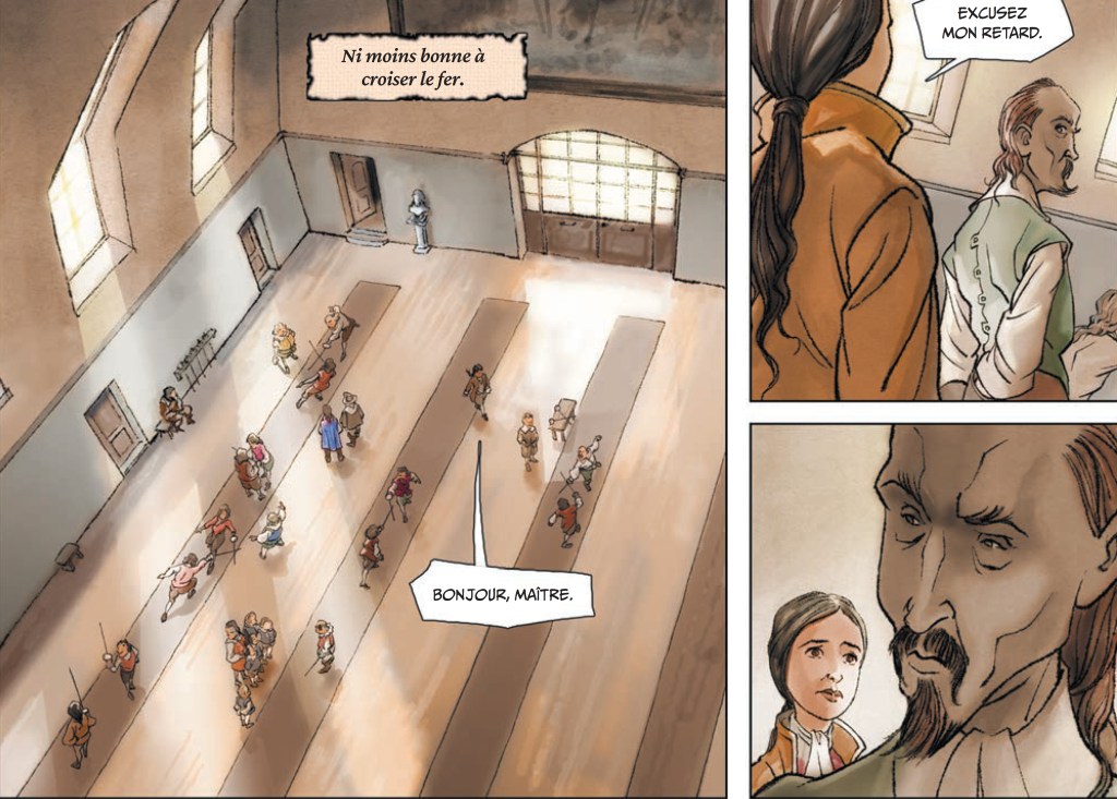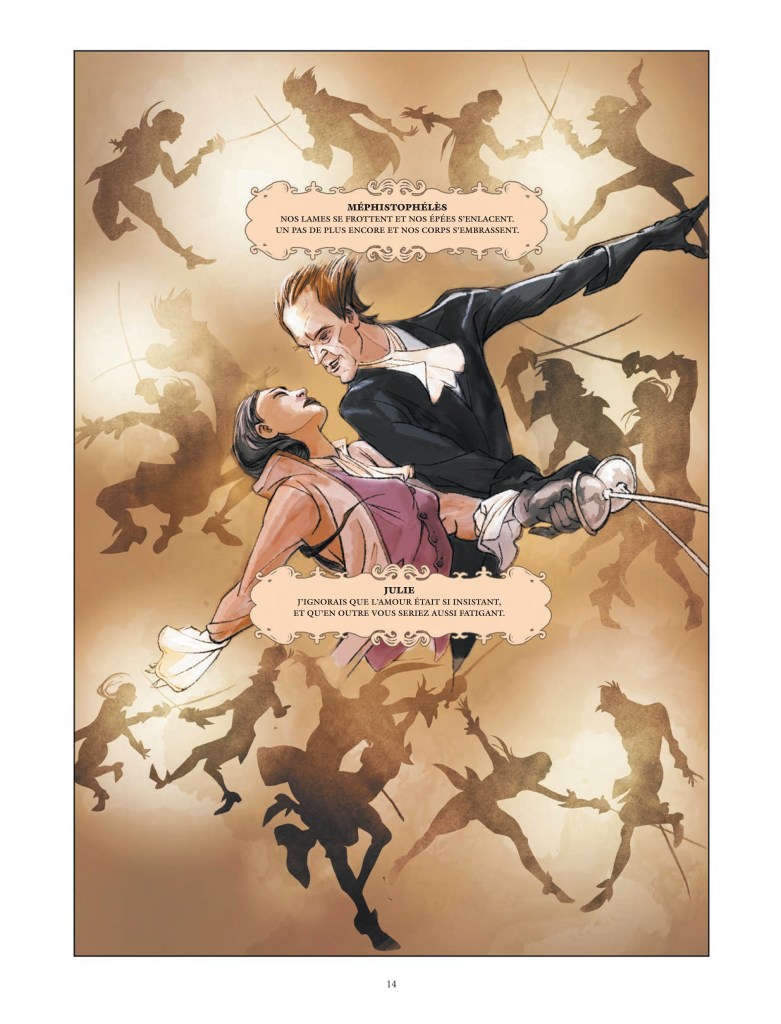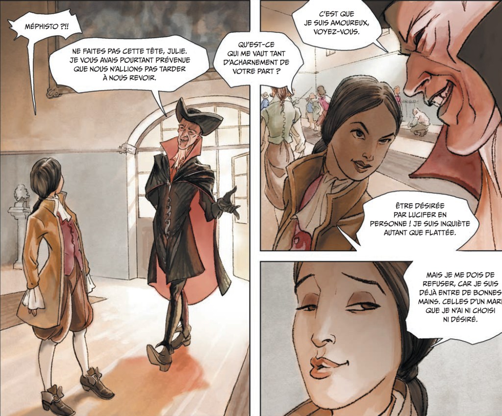Une fois encore, l’auteur a choisi d’adapter un roman, à la nuance près qu’il s’agit ici de la vie (bien réelle) romanesque à souhait de l’intrépide Julie D’Aubigny. Son trait enlevé s’accorde à merveille avec son sujet et j’ai rarement vu combats d’épées aussi bien traduits en dessin que dans Une pour Toutes. Par ailleurs, n’ayant pas lu le roman, je ne sait pas ce qu’il en est à l’origine, mais sa relation plus ou moins complice avec le Diable en personne est un vrai régal et Monféry a su, il me semble, personnifier à merveille Méphisto dans toute sa complexité d’ange déchu, à la fois fragile et puissant, drôle et maléfique… Bref, du vrai « En même temps »…