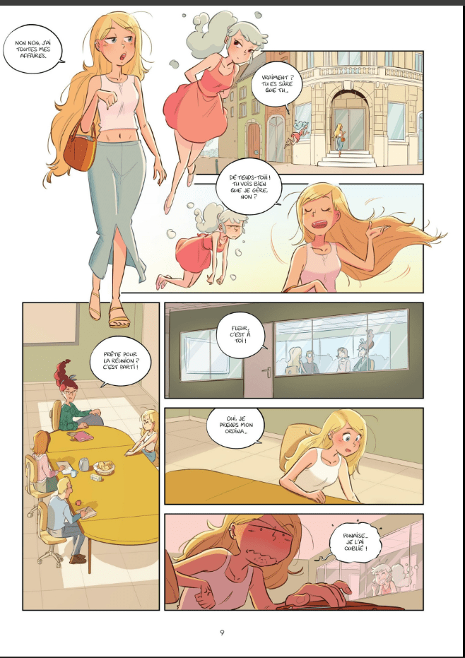 Dans le premier tome, Fleur se laissait aller, se dénigrait beaucoup, et était profondément malheureuse. Et puis un jour, POUF sa petit voix intérieur est apparue et Fleur s’est reprise en main grâce à son aide et ses multiples bons conseils. Nous la retrouvons donc ici totalement (ou presque) épanouie. A tel point, qu’elle veut faire pareil que sa conscience avec son amie Louise. Mais elle a tout faux, elle n’écoute pas vraiment son amie, ni sa maman, son compagnon et en soi elle-même. Elle a encore quelques petites choses à apprendre, mais elle est sur la bonne voie.