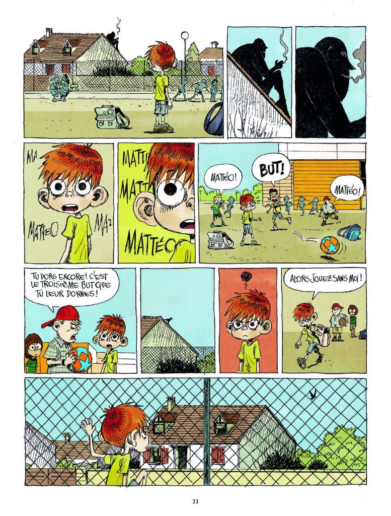 Ce qui m’a le plus marqué c’est cette fluidité dans le récit, ces éléments scénaristiques qui se mettent doucement en place et mènent à une révélation finale que l’on voit pourtant arriver. Le sujet des violences sexuelles sur les enfants est abordé à travers le regard très expressif de Mattéo. C’est un cauchemar récurrent qui l’envahit au quotidien et crée chez lui des peurs incontrôlables. De grandes planches decrivent les lieux (la chambre, le quartier) de façon tres détaillée et participent à donner un étrange tempo à la lecture, distillant des ambiances tantôt rassurantes et chaleureuses, tantôt obscures et terrifiantes.