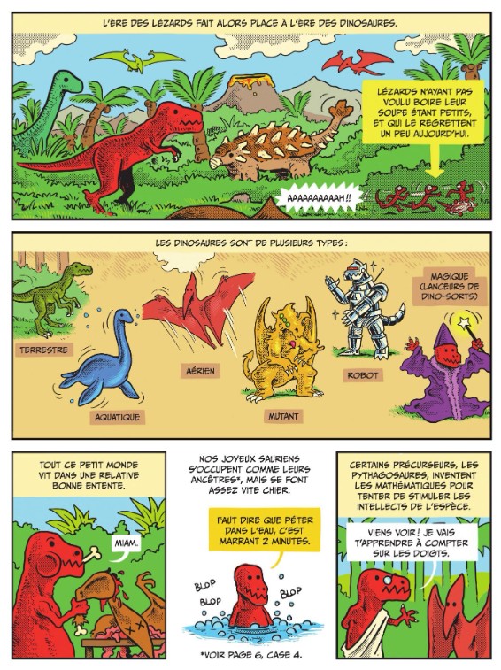 Tout y passe dans un méli-mélo de vérités et de fantaisies improbables, comme la supposée véritable cause de l’extinction des dinosaures en passant par la conception des Bisounours pas si “peace and love” que ça, jusqu’à la survie de la reine d’Angleterre et des Beattles. Même Taylor Swift a son strip de gloire au même titre que Pinocchio et le voyage sur la Lune. Sans oublier la conquête du monde par Mickey Mouse qui rachète tout en imaginant jusqu’où il peut aller…