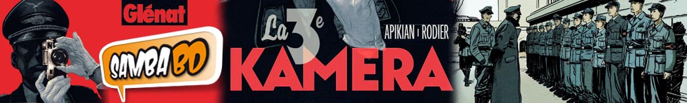 On est presque hypnotisé par la couverture de cette 3e Kamera. Cet officier SS qui nous photographie me donne presque des sueurs dans le dos. Voilà donc bien un album qui vous fera de l’œil quand vous le verrez en librairie. Un bel album, imposant, plus de 150 pages, qui nous narre l’histoire de ces reporters de guerre au service de la propagande de Goebbels. Le récit s’articule sur une assise bien réelle pour le contexte et ses personnages mais la trame est bien fictive. On s’intéresse surtout à l’immédiate après-guerre à Berlin qui est généralement très peu abordée comme époque. Vous imaginez bien le chaos qui y règne. En plus la pourriture survit encore au plus profond de ces ruines. L’immersion est excellente et le dessin de Rodier est d’excellente facture. Je serais un peu moins dithyrambique sur la colorisation. J’ai tout de suite tiqué à cause de l’omniprésence de ce jaune-vert qui donne une impression de « vieille photo » , ce qui était peut-être le but recherché mais je dois dire que je ne suis pas du tout emballé par ce procédé.