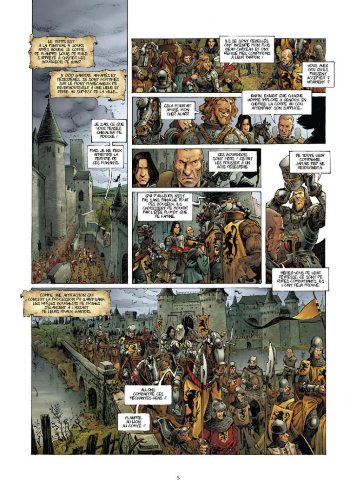 Je me suis replongée, sans vraiment le vouloir, dans l’Histoire du plat pays qui est le mien : la Belgique ! Ce sont maintenant les Flandres qui se rebellent, Bruges tombe sous la coupe des bourgeois de Gand, menés par Philippe Van Artevelde. Mes notions sur l’Histoire de Belgique sont un peu rouillées, mais ce nom m’évoque clairement quelque chose. Il est également fait mention de la célèbre bataille des Éperons d’Or.  Hey oui, la Belgique appartenait au royaume de France à ce temps-là… Ces notions sont importantes pour comprendre cet album. Le jeune roi, va-t-il réussir à maintenir la noblesse en place ? À combattre les bourgeois et les paysans qui voudraient voir les privilèges royaux et nobles tomber ? Ce sont des enjeux importants pour un si jeune garçon.