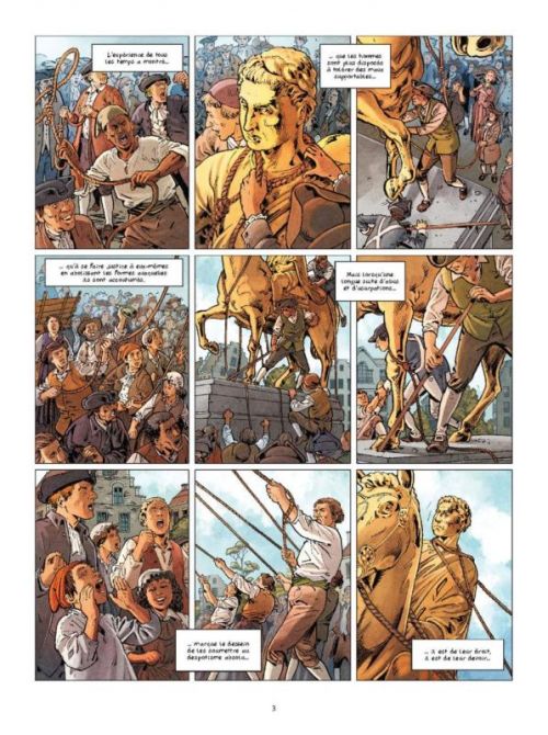 Chouette album, toujours un peu difficile à suivre (d’où ma note légèrement plus basse que le tome 1), mais comme je l’espérais, il contient davantage d’actions. Même si la part belle se fait aux négociations et arrangements divers avec les personnages politiques, les marchands et les militaires, avec qui Beaumarchais parlemente. Il est néanmoins intéressant de voir les « coulisses » d’un tel projet. En ce qui concerne les détails graphiques, il est tout à fait dans la continuité du premier tome.