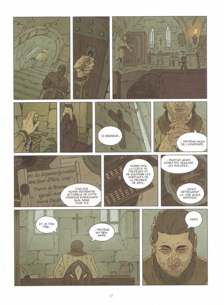 Un très beau roman graphique, d’une bonne longueur. La première chose qui m’a énormément charmée, c’est le poème au tout début. Il a ce côté mystique et honnêtement il est superbement écrit. C’est une histoire assez originale mais au fur et à mesure de ma lecture, j’ai vu un rapprochement avec l’histoire de Robin des Bois. En plus sombre, plus sanglante et plus étoffée également. Pierre De Gris revient des Croisades mais mort… C’est son ancienne amie et amoureuse de jeunesse qui le ramène à la vie, car Marion possède le pouvoir des trois fées qui tissent les destins. Je vois encore un autre rapprochement avec la mythologie grecque. Les Moires, sont trois déesses qui tissent le destin des hommes, sauf que dans le récit ici présent, ce sont des fées, mais des fées plutôt cruelles et noires.