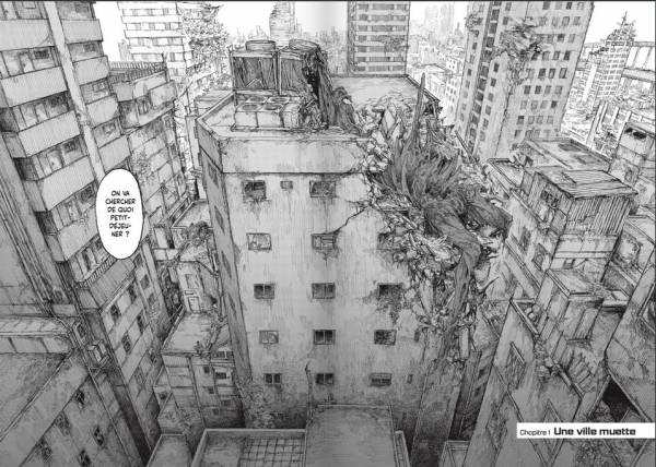 Mais, et c’est tant mieux, vous vous doutez bien qu’il y a un mais. Le dessin de Haruo Iwamune tout d’abord. Il est très beau, la désolation, le gigantisme et la solitude environnants sont parfaitement rendus. L’oxymore est perturbant: l’esthétique dévastation fixe le regard. Le noir et blanc sied avec l’ambiance de ce premier tome : sombre et silencieux. Le mal en lui même est mis en image avec inventivité. L’apocalypse vient de créatures « les condamnés » qui ont propagé des miasmes à l’origine d’une maladie : le mal cristallin. Les cadavres de ces monstres géants font d’ailleurs partie d’un décor urbain dévasté, ceux-ci étant littéralement incrustés dans les bâtiments, tels des squelettes fossilisés. Des protubérances en forme de cristaux cubiques constituent les principaux symptômes physiques de la pandémie. C’est là encore graphiquement marquant.