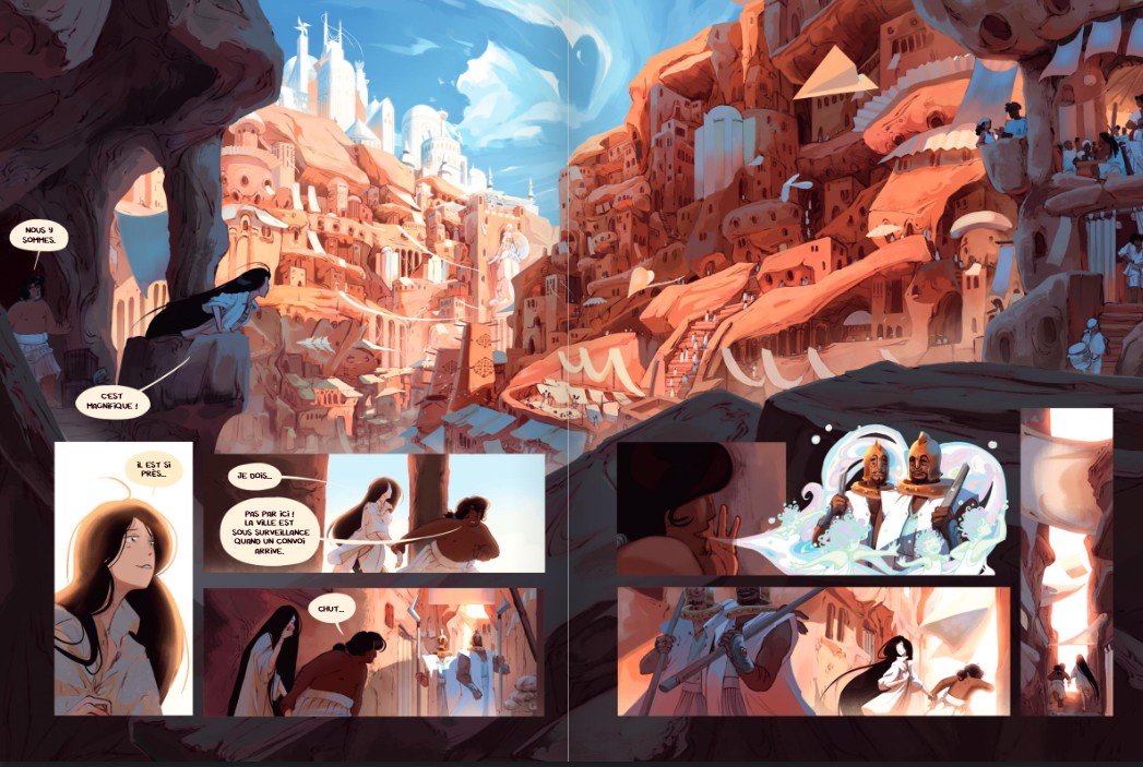 Difficile de ne pas tomber sous le charme de ce récit librement inspiré de la mythologie Grecque et des légendes tantôt de Orphée, tantôt de Pygmalion. Rien que le dessin onirique de Solen Guivre donne le ton de cette tragédie fantastique. Un trait soigné, des personnages dont il est si aisé de s’identifier et une colorisation, mes aïeux… entre la visualisation des chants divins d’Orphée et les décors sortis d’entre les dunes du désert : on ne sait plus trop où regarder !