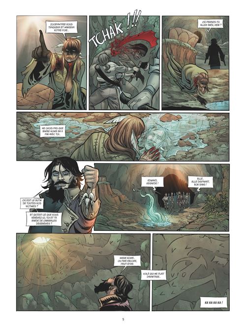 D’ailleurs, en parlant de mémoire, j’ai eu du mal à reprendre le récit, ça fait un an que j’ai lu le premier, me remettre dans le bain (d’eau de mer) ne fut donc pas aisé. Ces deux BD sont en effet bien mystérieuses, ce n’est pas sans me rappeler un film très célèbre sur des pirates et un trésor maudit dans une grotte, si vous voyez de quoi je parle… Il y a un rapport mais cette histoire est bien plus sombre et sanglante. On découvre donc comment Barbe Noire a acquis ses pouvoirs maléfiques et quel était le prix pour pouvoir les conserver. Si Rackham garde la tête du défunt pirate, ce n’est pas pour rien, elle le protège en quelque sorte. Il paie d’ailleurs pour la garder, quelqu’un d’autre de puissant garde son corps, qui est étonnamment parfaitement conservé, aucune trace de putréfactions malgré les années.