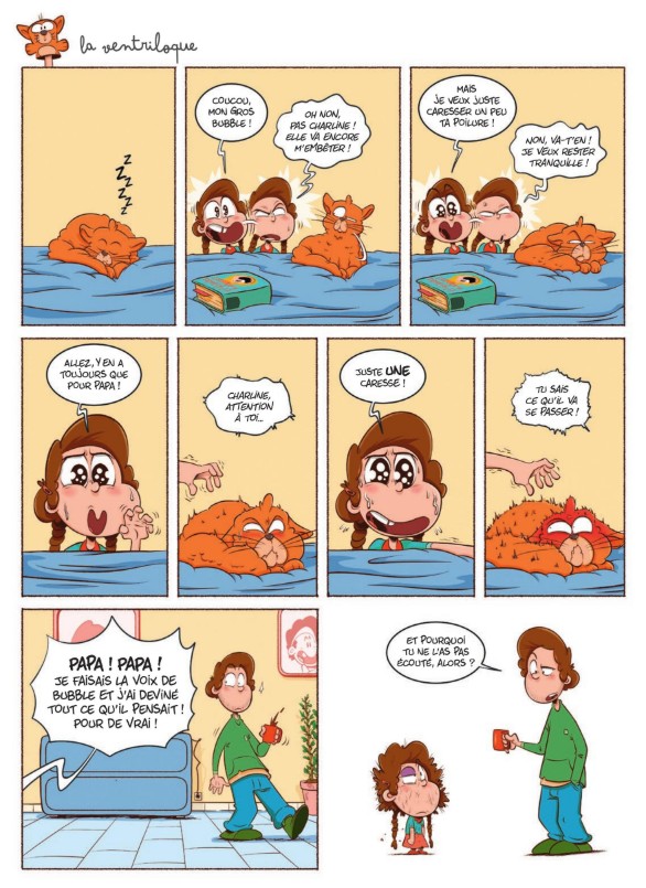 Au travers de ces gags, en une voire deux pages, Raoul Paoli déploie tout son talent d’artiste pour démontrer les facéties de sa fille, dans des situations qu’on peut imaginer sans peine si on a côtoyé un temps soit peu un chérubin de cet âge là… vouloir à tout prix caresser le chat, étaler son style graphique sur toute surface interdite aux crayonnages, rendre l’institutrice folle ou encore parier des bon-becs sur les événements se déroulant dans la cour de récréation…