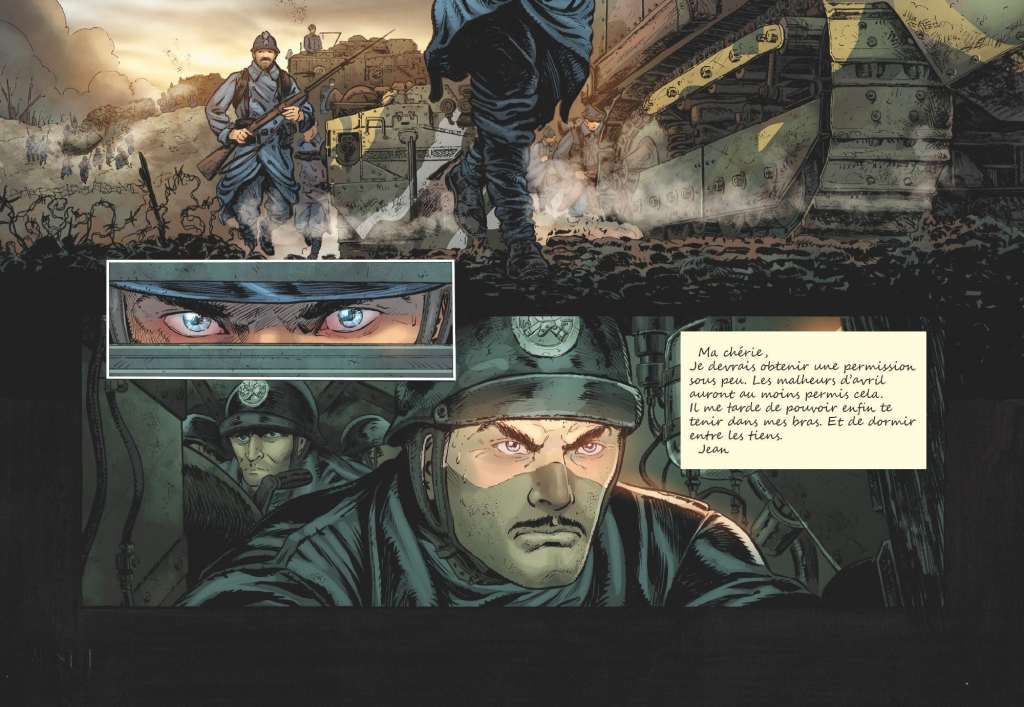 D’habitude, les textes écrits de façon manuscrite me dérangent car c’est compliqué à lire, mais je dois avouer que cette fois-ci, la police était plus grande et c’est passé crème. J’ai été beaucoup touchée par l’histoire de Jean, qui, malgré le décès de son épouse, retourne sur le front. Lui qui a aidé Louis Renault à concevoir les premiers chars. Même s’il a une période compliquée où il pense à rejoindre son épouse et prend des risques insensés, il se ressaisit et réussit à survivre à cette guerre affreuse qui a englouti tant de soldats. La manière de faire la guerre, cette absolue horreur qui devrait disparaître, évolue et devient plus moderne. Mais durant ces quatre années, la plupart des soldats étaient envoyés au massacre, tels de la chair à canon, dans une vision antique des combats. C’est donc bien une révolution dans la manière de tuer son ennemi, cela reste important car c’est une évolution des technologies, mais n’oublions pas le contexte dans lequel ce fut créé !