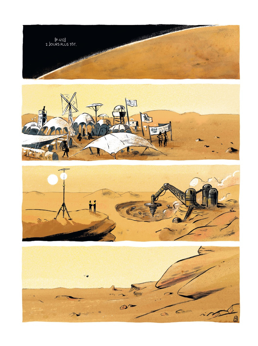 Fable écolo, conte philosophique et métaphysique, quête initiatique, le récit que propose Jop est un joyeux mélange de tout ça. Il pose la planète [P-412] en miroir de la Terre et aborde les thématiques environnementales du changement climatique et de l’exploitation forcenée des ressources. Rien de bien nouveau sous le soleil, si ce n’est l’approche assez mystique incarnée par cet étrange personnage extraterrestre sans visage suivi d’une non moins étrange grosse boule noire. Qui est-il ? Que fait-il ? Est-ce un dieu, un démon, un ange, un gardien, le vengeur de dame Nature ? … On ne le sait pas et on ne le saura pas. A chacun de se faire son idée et sa propre interprétation. Un peu comme dans 2001 l’Odyssée de l’espace avec le monolithe. Pourquoi pas ! Mais ça a un côté un peu facile et un peu frustrant.