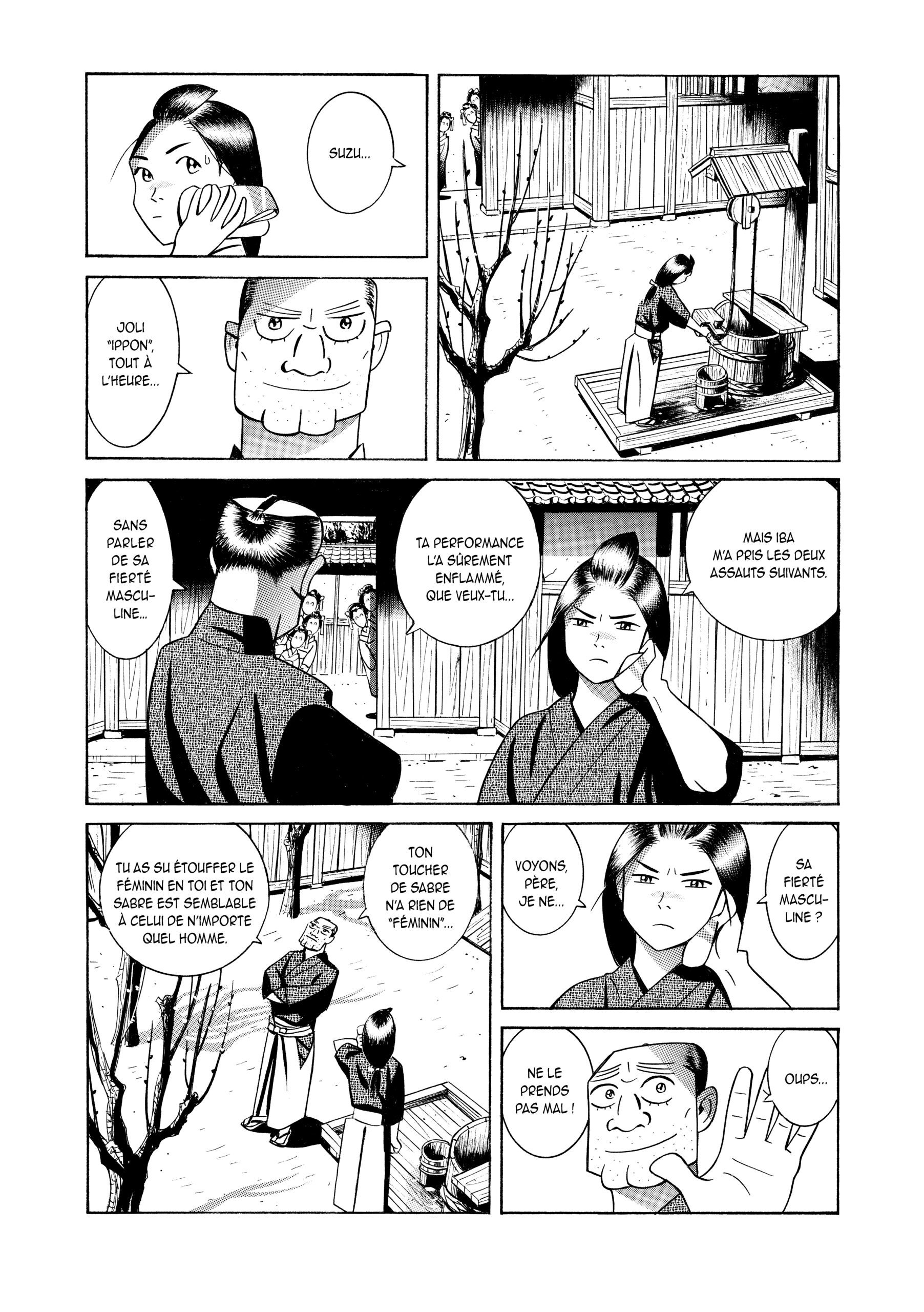 Une femme samouraï ? Presque… Suzu manie le sabre mieux que nombre de ses condisciples au dojo de son père. Même l’assistant de ce dernier éprouve des difficultés, non seulement à la battre, mais à ne pas tomber amoureux d’elle. Il faut dire qu’elle est très belle, même si le graphisme de l’auteur est plutôt simpliste, proche de ce qu’on attend des traits caricaturaux dans certaines BD comiques. Une façon, peut-être, pour Koichi Masahara, de mettre les sentiments de ses protagonistes en avant, plutôt que leur aspect physique.