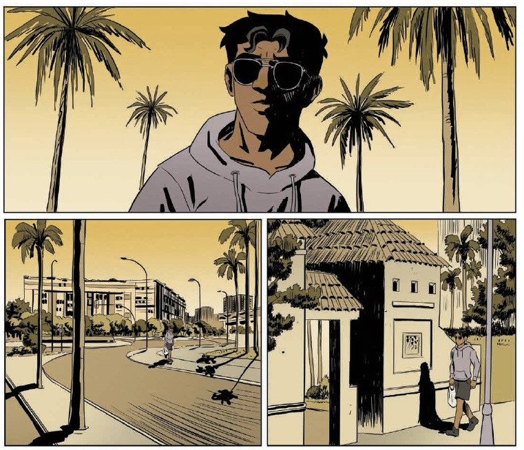 Un petit thriller policier de bonne facture qui se lit vite et ne nous force pas à trop réfléchir. L’identité du voisin chaleureux se devine rapidement et l’on sait comment cela va finir ! Restent les images de l’artiste James Blondel qui a su, sans presque aucun dialogue, nous montrer la solitude de cette station balnéaire hors saison touristique. Les rues sont vides, brûlant sous un soleil de plomb, presque pas une âme ne circule… Le personnage principal peut s’y sentir tranquille et sauf, si ce ne sont ces silhouettes lointaines aperçues par-ci, par-là et ce voisin de palier jovial à qui on donnerait le bon Dieu sans confession… La narration est mûrement pensée par Mark Eacersall qui, travaillant étroitement avec l’artiste, nous donne un récit fluide au découpage graphique digne du meilleur cinéma policier.
