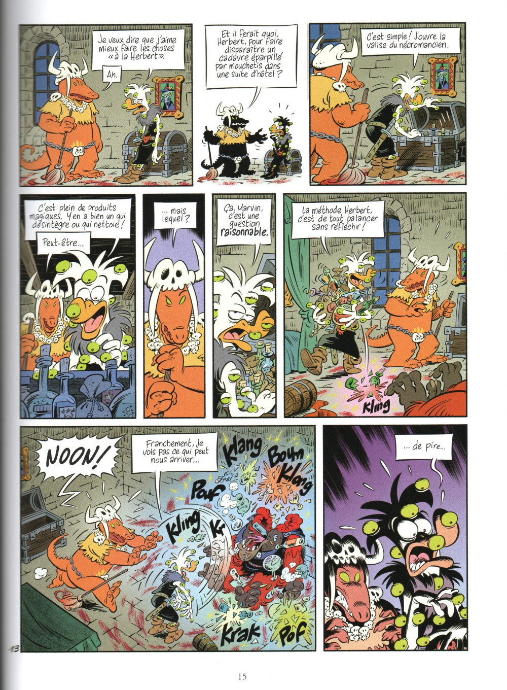 Du Donjon Parade, on va en manger cette année ! 6 nouvelles aventures sont prévues, dont voici la troisième. Nécromancien pour de faux ou faux nécromancien, c’est kif kif et Herbert, cet imbécile, se retrouve bien malgré lui au 28è congrès des nécromanciens auquel Horous (le vrai nécromancien du Donjon) a refusé de se rendre pour cause de surcharge de travail. Évidemment, ce pauvre imbécile d’Herbert ne fait pas le poids et vomit tripes et boyaux dès la première conférence, pourtant fort instructive sur l’usage du pus des cadavres. Par dessus le marché, il provoque en duel le plus dangereux des nécromanciens, un orang-outan super costaud. Bref, Herbert se fout lui-même dans la mouise, Marvin fait tout ce qu’il peut pour le sauver et éviter la fin du monde.