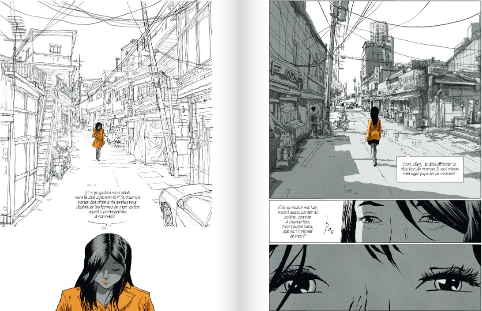 C’est un coup de massue, tant pour le lecteur que pour la jeune femme dont il est question dans cet album. Elle est tombée enceinte accidentellement, il est trop tard pour avorter et son partenaire d’un soir a fuit ses responsabilités. Seul Jung, sans le savoir, lui a donné le courage d’entreprendre un parcours difficile, après avoir lu l’adaptation en Coréen de son livre. On les retrouve alors, chacun dans leurs doutes et leurs inquiétudes, leurs remords aussi, quand ils se rencontrent en Corée…