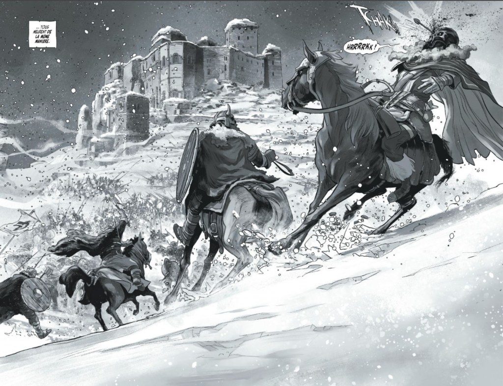 Gros boulot sur le noir et blanc en début d’album ou Tirso nous balance des environnements enneigés de toute beauté, pour ensuite en mettre plein la vue lorsque la couleur revient par à -coups. Ses personnages aux visages burinés sont un plaisir à suivre et l’innocence du gamin (dont on taira le nom) contraste tout cela en nous maintenant captivés sur l’ensemble de l’album.