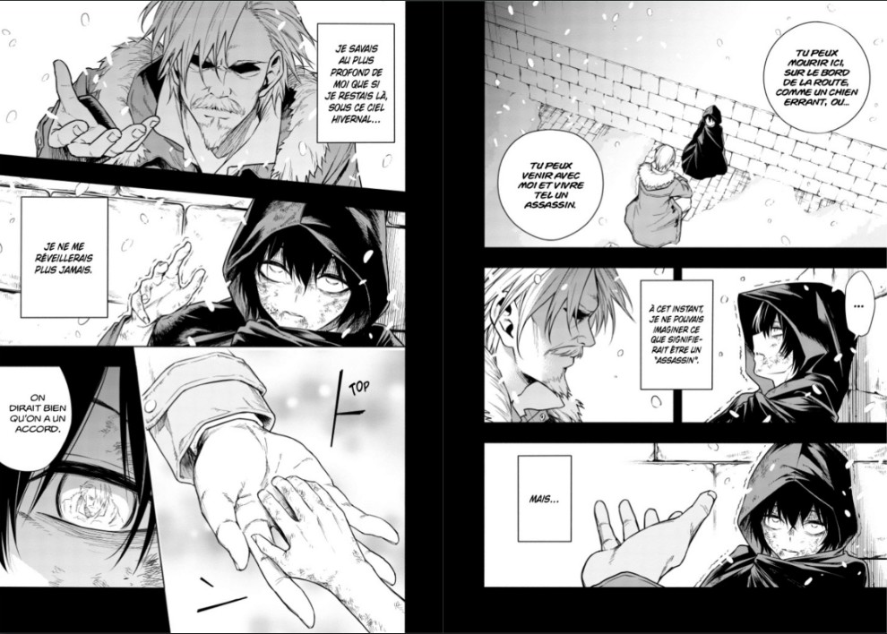 Mais alors que le vent semble tourné pour Ars (qui, soit dit en passant, semble avoir plus de cinq ans en début d’ouvrage…), Yusura Kankitsu nous réserve une petite surprise. Son héros ne va pas simplement être élevé par un noble charitable jusqu’à son entrée à l’école, nooooon… il va être formé pour devenir un tueur à gages. C’est un peu tiré par les cheveux de prime abord, mais il faut avouer que dans cette catégorie de manga, il ne reste plus grand chose à développer tant le sujet a été tordu jusqu’à la dernière goutte.