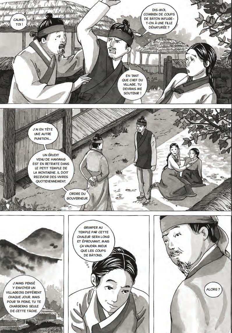 Accompagné par le trait fin et délicat de Carine Borgi (qu’on aurait franchement préféré en couleurs, comme dans les quelques dessins en fin d’album, reprenant un texte plus didactique), nous plongeons avec délectation dans la vie de Dal-Rae, une jeune paysanne curieuse et intelligente qui réussit à changer le cour de sa vie, évitant ainsi un mariage prédestiné à être malheureux… Si les protagonistes principaux sont fictifs pour agrémenter le récit d’une romance interdite, le contexte est, quant à lui, bien réel.
