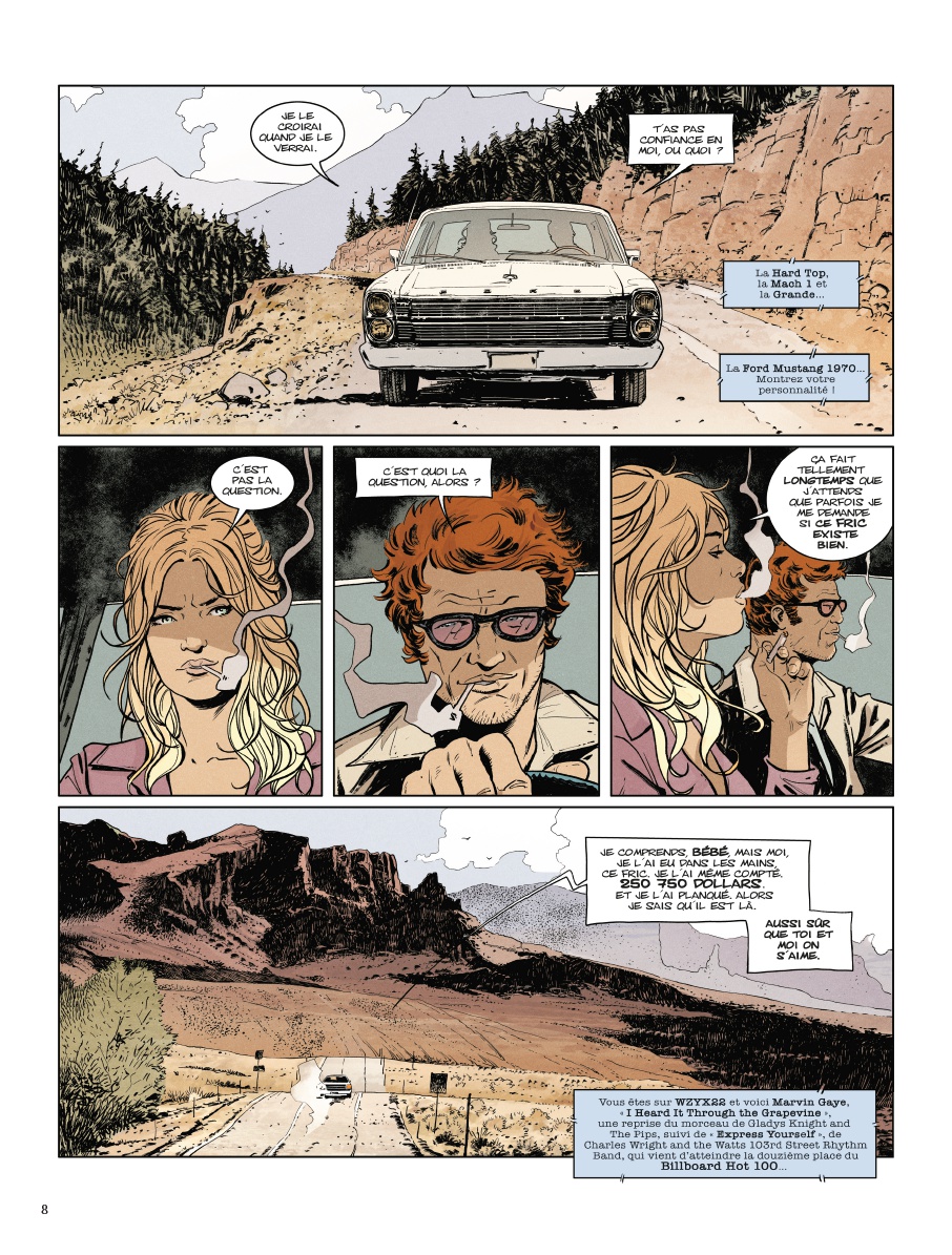 Matz et Xavier nous proposent là un savant mélange de polar noir, de western moderne flamboyant et de road movie suffocant, laissant peu de place à la rédemption. Les personnages sont tous dévorés de l’intérieur par leur avidité et sont prêts à tout sacrifier pour un hypothétique et hypnotique magot.