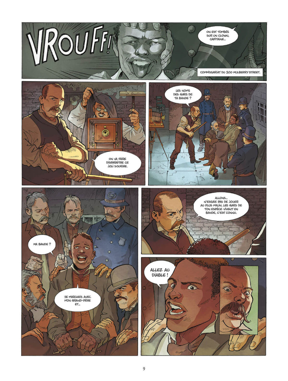 Dans cette mini série prévue en deux tomes, Tom Graffin et Jérôme Ropert nous proposent un polar qui nous embarque dans l’histoire américaine de l’après guerre de Sécession. Si la guerre gagnée par les Nordistes a mis fin à l’esclavage, les tensions raciales n’en restent pas moins exacerbées, particulièrement à New York, contrôlée par la Tammany Hall, émanation du parti démocrate fortement lié à la pègre et corrompu jusqu’à l’os. Rappelons au passage, qu’à l’époque, le parti démocrate défendait l’esclavage face au Parti républicain. Ce point à son importance dans l’histoire de Dred Scott, puisque cet Afro-Américain est un descendant d’esclaves qui va tenter de gravir l’échelle sociale. C’est un flic qui lui donnera sa chance. Une chance qu’il va saisir en démarrant tout en bas de l’échelle. Une échelle qui le mènera sur le chemin de ses origines.