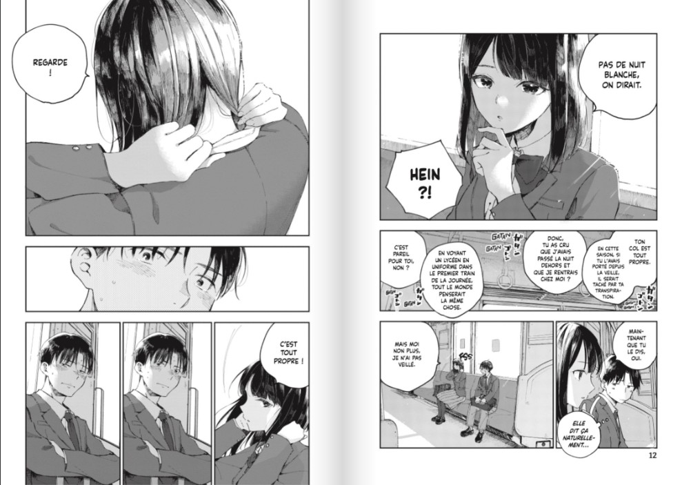 La première, qui se déroule donc “Dans le premier train du matin”, est de ces récits dont on aimerait connaître la suite ! Katogi a décidé de prendre le premier train, bien trop tôt pour se rendre directement à l’école. Mais quelle n’est pas sa surprise d’y croiser une camarade de classe qui n’a, à priori, aucune raison, elle non plus, d’être debout si tôt. Or l’esprit de déduction de Satsupukei et leur conversation donne irrémédiablement envie de savoir où cela peut les mener. C’est intriguant. Mais comme l’auteur nous a fourni toutes les réponses aux premières interrogations qu’on a pu se faire… Place à la suite.