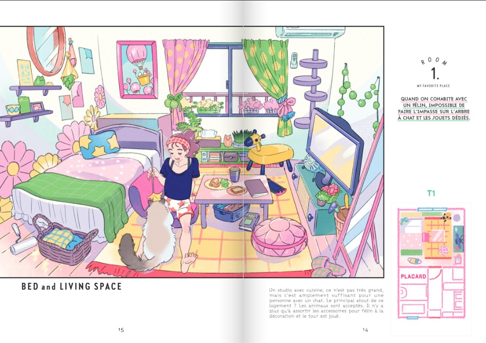 Découvrez un art-book rassemblant des illustrations et courtes bandes dessinées où des jeunes filles vivent leur quotidien dans des intérieurs colorés. Neuf pièces sont présentées, et chacune contient une narration, un univers, un animal bien particulier…