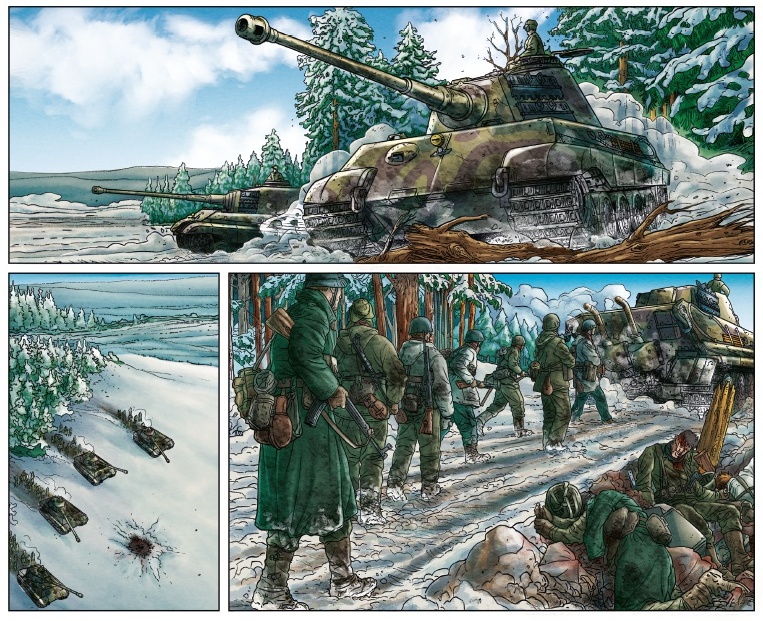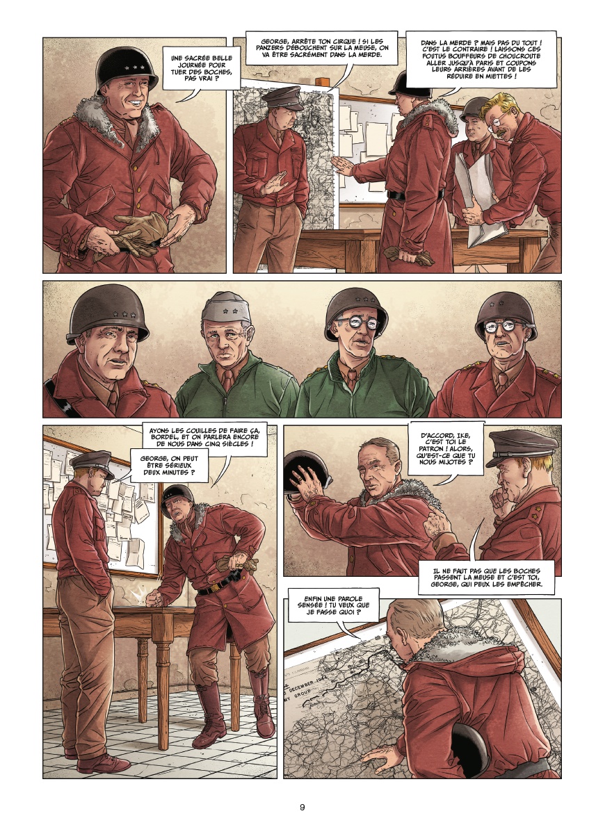 Je suis assez déçu par la plupart des dernières sorties franco-belges et comics qu’il m’est donné de lire ! En effet, on dirait que les éditeurs sortent des titres à tout va afin de faire du chiffre et du volume. Ce Patton, première volume de la nouvelle collection « Les Maîtres de Guerre » chez Delcourt n’échappe pas à la règle. Si vous aimez le genre et avez vu le film Patton (1970 – de Franklin J. Shaffner avec George C. Scott), vous savez tout sur le personnage et n’avez même pas besoin d’ouvrir ce livre (dont plusieurs cases rappellent étrangement le film). De plus l’album s’attarde sur la Normandie et la bataille des Ardennes, certes importante, mais pas le seul fait d’armes de Patton. L’entrée en zone allemande et la découverte des camps d’extermination sont légèrement évoquées et l’album s’achêve sur l’accident qui causa la mort du général. La personnalité de Patton, avec ses commentaires souvent sujets à caution, est bien dépeinte mais aurait pu être approfondie. Bien entendu, on ne peut détailler la vie d’un homme aussi important dans une B.D de 54 planches. Un dossier de 8 pages assez intéressant termine le volume. Pour ce qui est des illustrations, rien à dire sur le travail des artistes et coloriste, habitués de ce genre de bande dessinée.