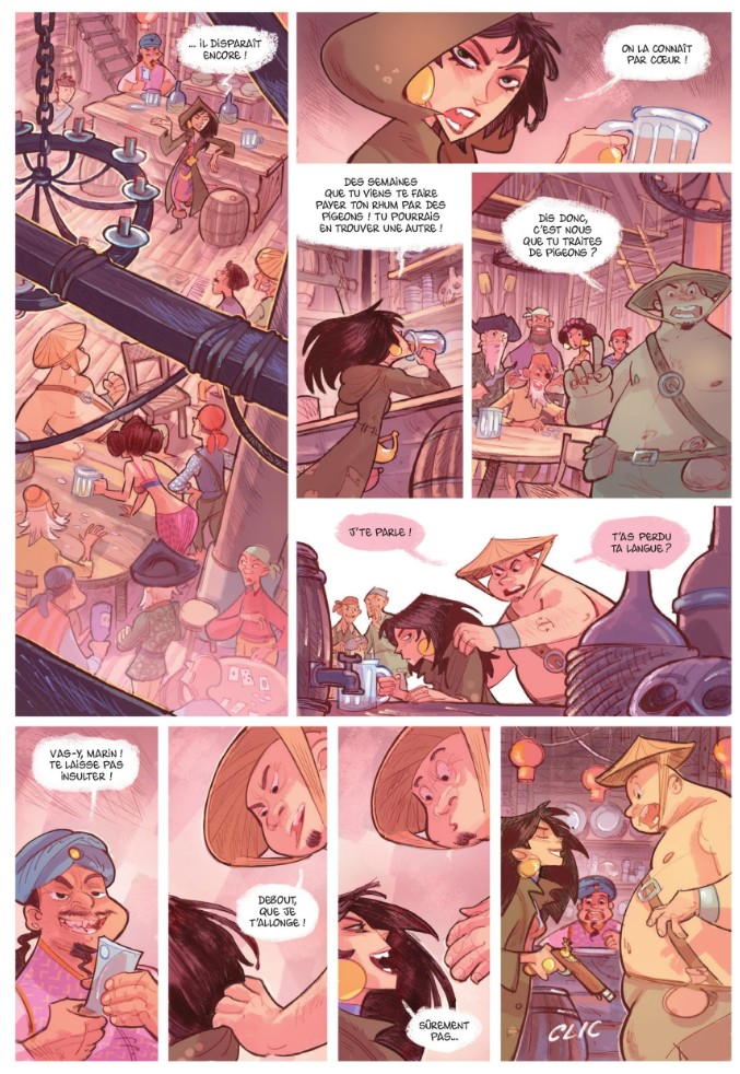 Le ton est parfois grinçant, juste comme on aime à entendre les pirates parler, le graphisme plutôt dans l’air du temps, détaillé avec minutie, avec des protagonistes qui sillonnent les îles de l’actuelle Indonésie. Tantôt inspirés de personnages réels ayant vécu à une autre époque, comme Jin Shai, ou émergeant de l’esprit de l’auteur. Des caractères bien trempés qui collent aux lignes relativement claires à quelques exceptions près qu’on pardonnera facilement. Alors : en avant moussaillon, souquez ferme !
