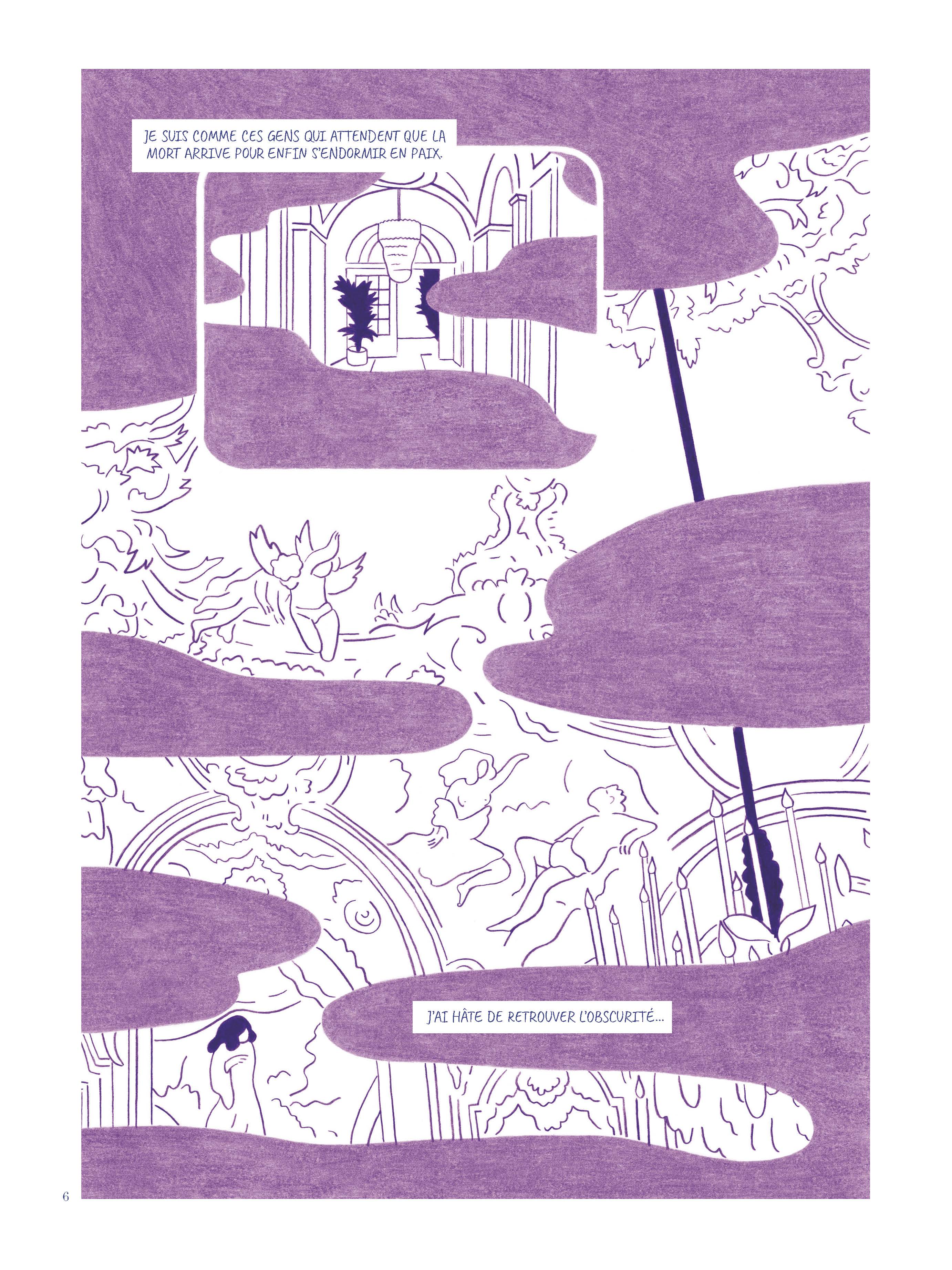 Aurélie Wilmet nous permet de découvrir l’intimité de cette femme qui semble n’avoir jamais trouvé l’approbation qu’elle espérait : la sienne, sur un fond de pages en dégradés de violet vers le bleu profond, comme sur la couverture. Les traits des personnages sont épais, et une certaine langueur semble s’afficher sur chaque visage. D’autant plus celui de Diane Arbus qui ne semble jamais satisfaite, comme une perfectionniste ne pouvant que toucher du doigt son rêve de photos bien particulières.