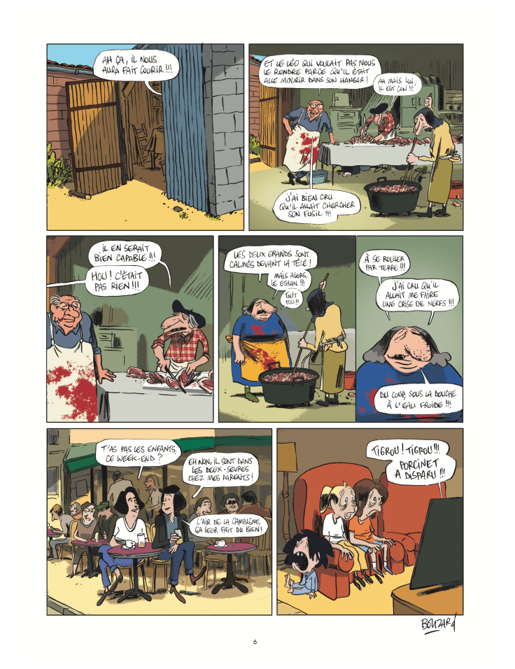 La BD est poilante. Tout semble rebondir sur Colette qui gère tout à la ferme. Les enfants sont propulsés dans un univers totalement différent du leur, ce qui crée des situations marrantes. L’innocence de l’enfance est confrontée à la rudesse de la campagne. La caricature fonctionne parfaitement, tout comme le comique de répétition qui donnent un cocktail qui m’a beaucoup plu. Mention spéciale enfin au petit Ethan formidable en nouveau Disciple (non consentant) de Léonard et au vieux Paulo qui veut « le gros cul » de ses voisines. Vivement le tome 2.