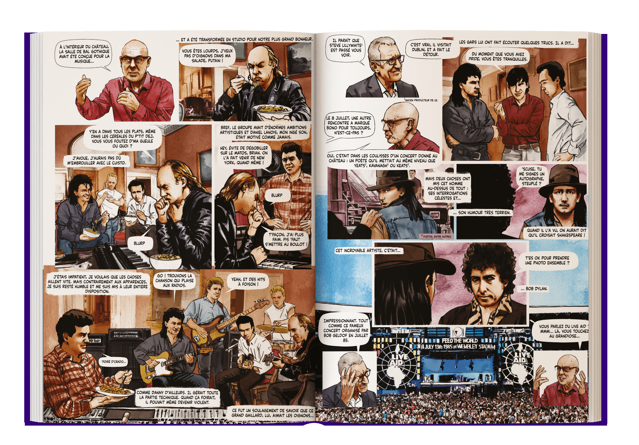 Nous sommes en 1976 à Dublin, ils sont 4, ils ont 17 ans, ils sont dans le même lycée, ils ne le savent pas encore, mais ils vont devenir l’un des plus grand groupe de rock du monde. Larry Mullen Jr a une batterie et veut monter un groupe. Il placarde une petite annonce sur les murs du lycée et recrute Adam Clayton qui a une basse mais ne sait pas en jouer, David Evans qui bricole des guitares avec son frère, et Paul Hewson qui se mettra au chant parce que personne d’autre ne veut le faire. 40 ans plus tard, on retrouve les 4 mêmes (cas rarissime de longévité et stabilité pour une formation rock) avec David Evans et Paul Hewson qui se font appeler depuis les débuts respectivement The Edge et Bono. Nous découvrons l’origine de ces pseudonymes dans ce docu BD.
