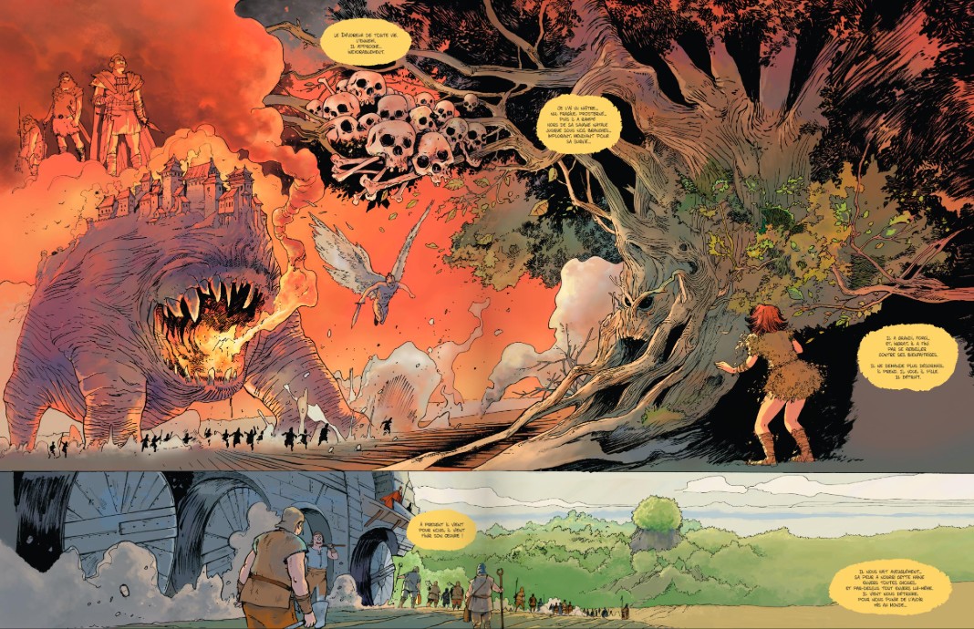 Cécile, qui nous a habitué à des traits dédiés aux plus jeunes publics, comme avec “Coboye” ou encore l’excellente série “Mauve Bergamote” pour ne citer que ces deux titres là, fait des prouesses avec les personnages mis en avant, Automne et Cynan, le duo (couple ?!) principal. Lionel Marty apporte quant à lui une approche plus dur et froide, visible chez les humains et cette forteresse démoniaque. Un contraste qui se veut approprié entre la Nature presque sans défense et l’humanité dépourvue d’empathie.