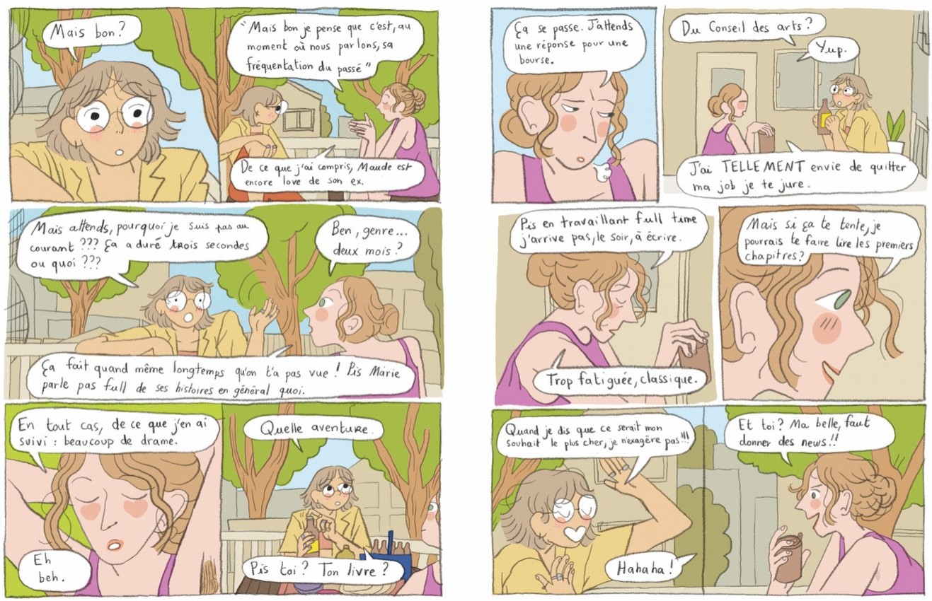 Mirion Malle écrit comme on parle au Québec, les phylactères sont d’ailleurs manuscrits en lettres séparées qu’on imagine aisément écrites au crayon. De même que son dessin qui est plutôt enfantin, minimaliste... ce qu’on retrouve souvent dans les romans graphiques (et qui joue sur la corde sensible de mon appréciation : j’y arrive pas !).