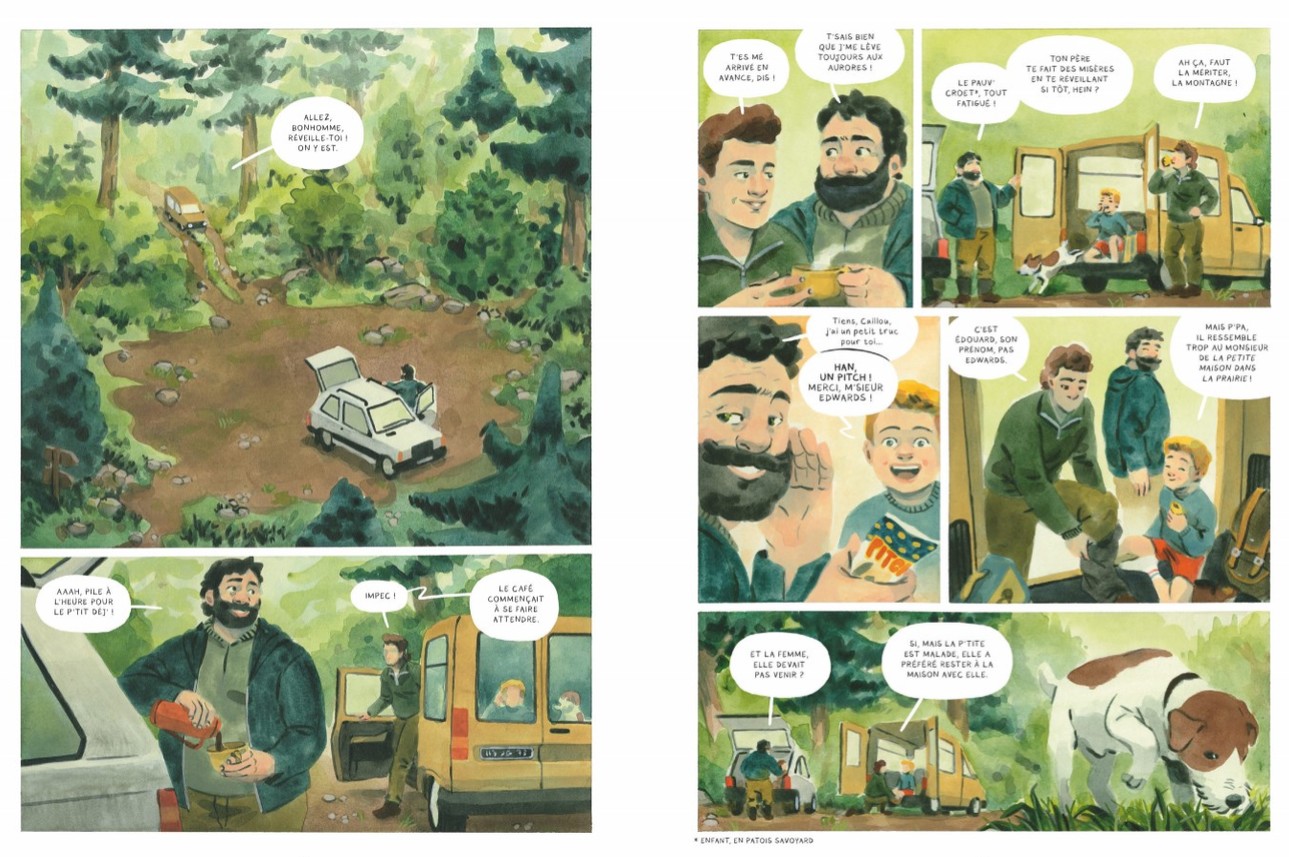 Un roman graphique sur un artiste désabusé, c’est un peu le serpent qui se mord la queue (sans faire de jeu de mots douteux sur la sexualité du personnage principal de ce récit). Pierre grandit pourtant dans un environnement qui ferait envie à nombre de personnes, à crapahuter dans les Alpes avec son père et le meilleur ami de celui-ci. Régulièrement, chaque année, ils attaquent le mont du grand-duc et chaque année, on ressent la distance qui s’installe et grandit entre père et fils. Toutefois, il est important de faire ces retours en arrière dans la vie de Pierre, pour comprendre sa vie actuelle.