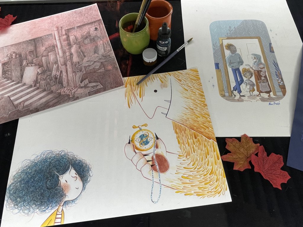 On termine sur un ton plus léger et on change d’ambiance en rentrant dans l’univers de Léa Mazé. Un univers sensible, délicat, poétique, touchant. Une pointe de douceur dans un monde chaotique et brutal, qui invite à la flânerie et au rêve. Léa Mazé est illustratrice, dessinatrice, sculptrice, céramiste, elle touche un peu à tout et surtout elle nous embarque dans son monde où se mélangent imaginaire, enfance, innocence, mystères et nature. Elle aime les cimetières, nous a-t-elle dit. Non pas par un aspect morbide mais pour le calme, l’apaisement et le mystère qu’ils incarnent. C’est d’ailleurs le thème de sa série phare, Les Croques (3 albums – les éditions de la gouttière) qui parle de deux enfants qui vivent dans un cimetière, puisque leurs parents sont croque morts. Ils vont mener une petite enquête, parce qu’il y a un truc bizarre dans une tombe…