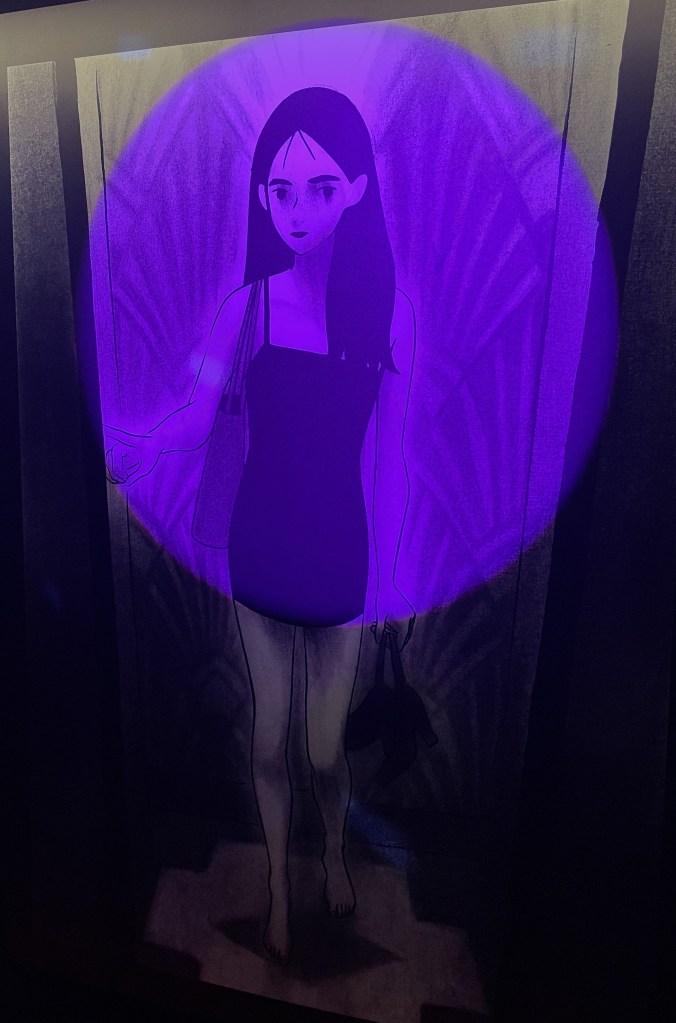Le sujet de l’album est dur – la prostitution dans le milieu étudiant – mais il est traité avec pudeur, ce qui est parfaitement retranscrit dans l’expo. « On voulait reproduire cette douceur qu’il y a dans l’œuvre et donc du coup la difficulté numéro un c’était de trouver un éclairage et des accroches qui ne soient pas agressifs. ». Ça marche et ça match. On suit l’évolution de l’album au rythme d’un spot rose qui balaye les planches exposées. Chaque passage sur une planche renvoie une image projetée sur une structure au centre de la pièce, représentant la chambre d’étudiante. Ainsi, le regard se promène des planches exposées à leurs prolongations projetées. Il y a un côté un peu magique et féérique dans cette expo, aux antipodes du sujet de l’album, qui donne vraiment envie de lire l’album.