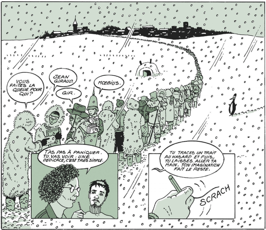 Pour les dédicaces de Moebius, je peux témoigner de sa méthode : tracer un trait et laisser aller son imagination. Je l’ai vu faire !