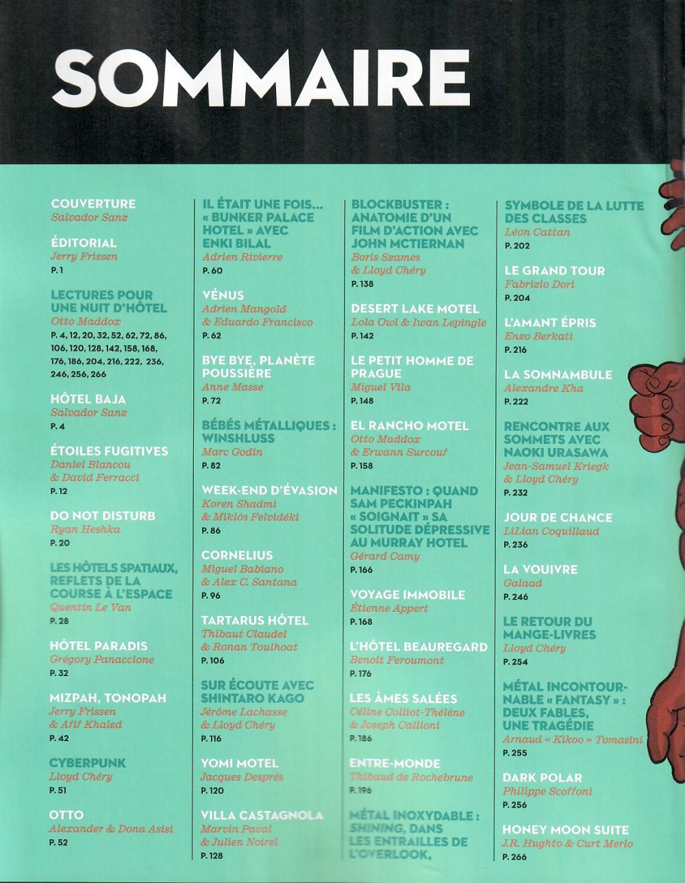 Au milieu de ces récits multidimensionnels, vous trouverez divers articles (les hôtels spatiaux ; anatomie d’un blockbuster ; dans les entrailles de l’Overlook), des entrevues (Bilal nous parle de son film Bunker Palace hôtel ; Naoki Urasawa), et les conseils de lecture d’Otto Madox pour se faire peur au cours d’une nuit d’hôtel.