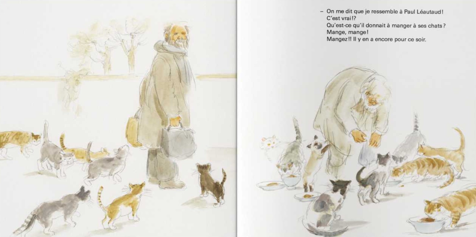 Ce sont des chats des rues, ces pauvres abandonnés de la vie qui doivent se débrouiller pour trouver de quoi manger, de quoi s’abriter… C’est hélas le sort de tellement de chats qui ne trouvent pas de place dans les refuges déjà débordés. Alors il y a ces dames (oui, ce sont souvent des dames d’un certain âge) qui s’en occupent comme elles peuvent : offrant un peu de tendresse et de nourriture. C’est mieux que rien… Mais c’est tellement pour eux que, quand Juliette disparaît, c’est le désespoir. Celui qui les pousse à tenter leur chance auprès d’un vieil homme solitaire.
