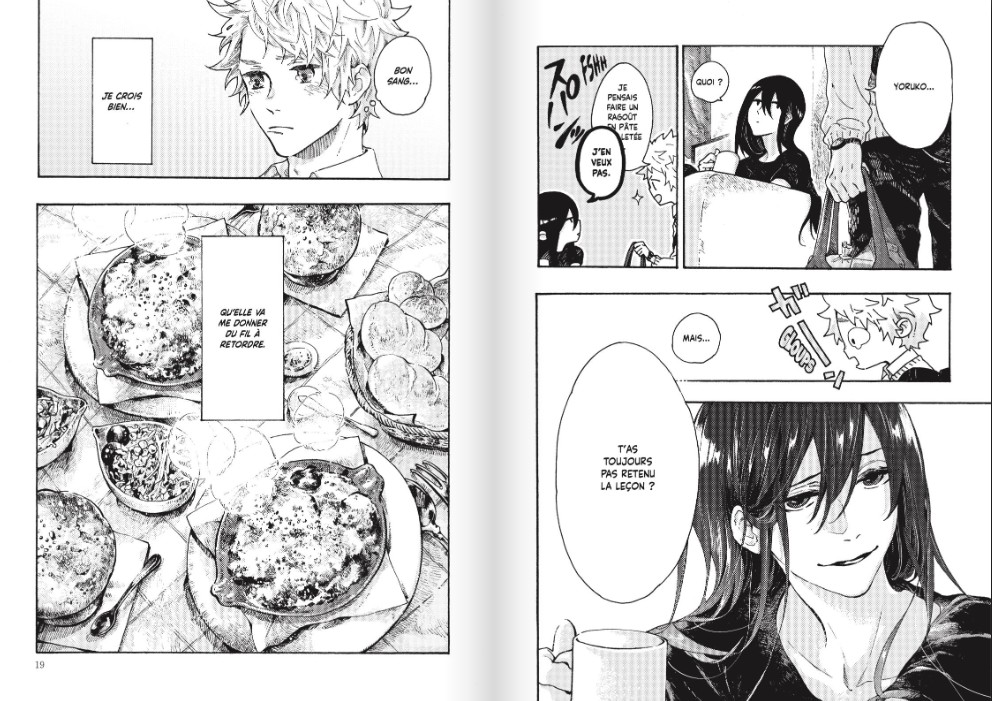 Tous les deux portes un lourd fardeau sur le cœur, Mahiru, plus seul que jamais depuis le décès de sa maman quand il était petit, s’est réfugié dans la cuisine. Yoruko, quant à elle, ne mange rien ; se contentant de fumer et boire du thé accompagné de quelques compléments alimentaires. Pourquoi ? Mystère ! Tant pour le lecteur que notre jeune héros… Ce n’est pourtant pas faute de lui préparer de bons petits plats chaque jour.