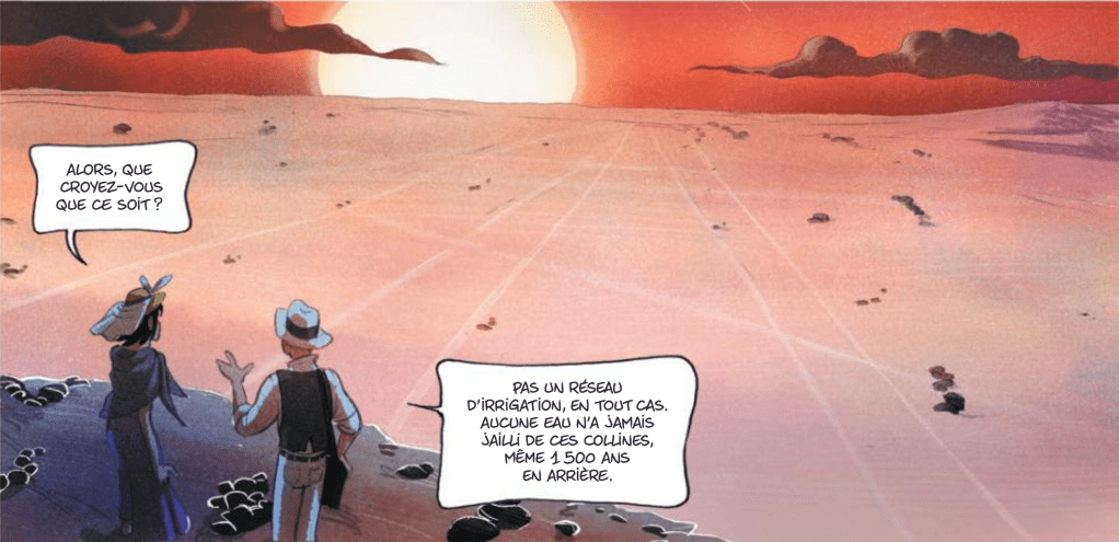 Côté BD à proprement parler, c’est solide aussi. Le scénario est assez classique, un journaliste rencontre une Maria déjà âgée et la questionne sur les débuts de sa passion pour les lignes de Nazca. L’histoire est donc faite de flashbacks narrés à la première personne, ce qui permet les ellipses et, surtout, de se focaliser sur l’essentiel. Pas de longueurs, donc, durant ces 112 pages.