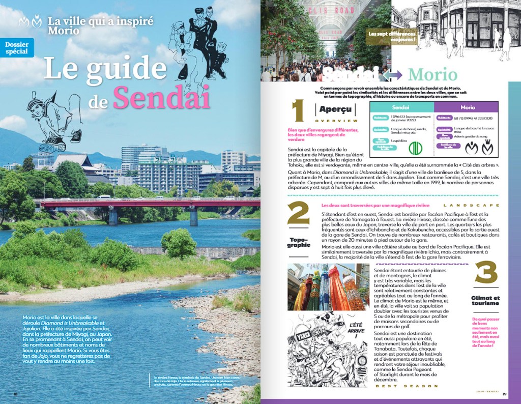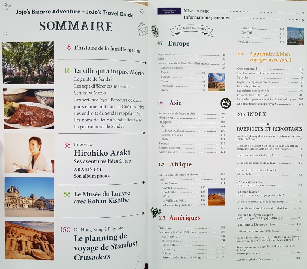 Dans la même vibe que le JOJO Magazine ce Travel Guide peut se voir comme une hors-série de Jojo’s Bizarre Adventure, sauf que cette fois on s’intéresse à la partie voyage de l’univers. Sur une série qui dépasse maintenant les 140! tomes et des parties qui vont nous trimballer du Japon avec Morio (son équivalent du Sendai), en passant par l’Egypte, l’Italie ou allant même jusqu’à faire une course hippique à travers l’Amérique dans Steel Ball Run il est fort logique de sortir ce guide de voyage, qui va nous comparer les lieux et paysages réels de ceux de la série, tout en rajoutant des petits reportages photos, une interview d’Araki et divers autres petits bonbons qui régaleront les fans.