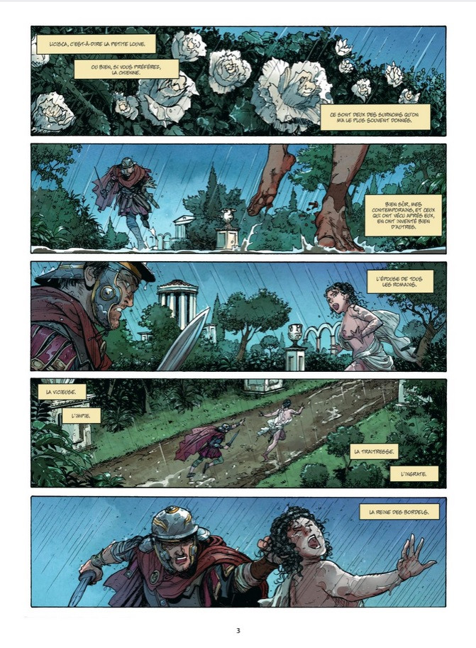Et c’est son cœur et son énorme manque d’amour jamais assouvi qui fera sa perte…Elle va épouser un autre homme alors qu’elle est mariée à Claude. La bigamie à Rome est punie de mort, et hélas la sentence ne tardera pas à tomber. Pauvre Claude, il aimait Messaline à sa façon, mais ce qu’il ignore, c’est que les vices de son épouse ont été largement encouragés par quelqu’un qui manœuvre dans l’ombre de l’impératrice depuis le début. Pauvre Messaline, son histoire est triste. Personnellement, je doute qu’elle ait eu autant d’amants que le dit la légende. Je pense qu’elle était un pion à abattre pour accéder au pouvoir, elle devenait gênante et surtout son fils. J’ai beaucoup apprécié le point de vue donné sur son histoire, les dessins et aussi le découpage des cases donne une lecture dynamique. Excellent opus qui est à lire avec les tomes d’Agrippine, car ces deux femmes se sont largement côtoyées. Je vous laisse le plaisir de la découverte.