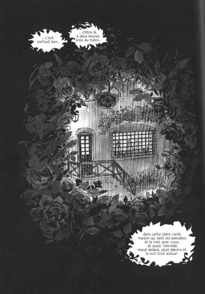 « …C’est surtout bon… d’être là, … dans cette chère vieille maison qui sent les pan-cakes et le miel, … chaud dedans, pluie dehors et la nuit tout autour. »