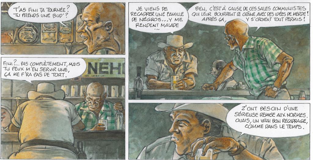Les dessins d’Hermann m’ont toujours fait de l’effet, à chaque fois, j’ai l’impression de lire la veulerie, la bêtise et la violence sur les visages de ses personnages. Ceux-ci n’échappent ni à la règle, ni à leur sort. Ça se termine mal pour tout le monde.