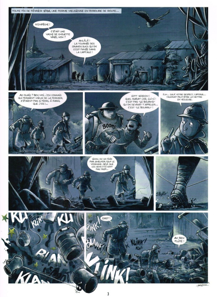 J’avais déjà bien apprécié l’anecdote quasi véridique des cuistots de la guerre de 14 dans le tome 2. La grande guerre c’était pas jojo, le froid, la boue et la grande faucheuse pour finir le boulot. Dans cet album, on approche un peu plus la terreur, la folie et la mort. Les auteurs évoquent la présence de soldats nord africains, si peu mis à l’honneur dans la défense de la France. C’est un album un peu angoissant qui se termine par l’arrestation de Palette par la maréchaussée. Le Conseil de Guerre c’est pas de la gnognotte.
