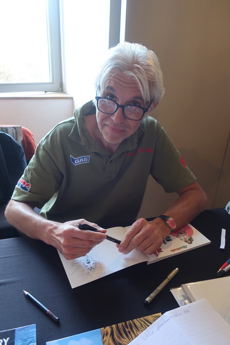 A l’occasion de la publication du carnet d’illustrations Spa-Francorchamps Motos, L’Abbaye de Stavelot, la Galerie Aarnor, le club Moto 80 et les éditions Point Image ont organisé le 28 août à l’Abbaye de Stavelot une séance de dédicaces avec les auteurs pour promouvoir ce carnet de croquis.J’ai donc proposé aux auteurs présents soit notre questionnaire du mouton classique ou le questionnaire du motard. On commence avec le scénariste de Sara Lone, de Celadon Run : Erik Arnoux qui a choisi le questionnaire du motard ! Ça fera plaisir à notre chroniqueur Loubrun je pense.